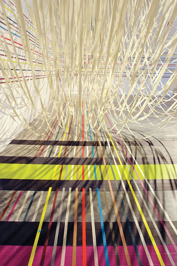 Ward has striped the walls, marked the floors and swathed the concrete columns of CAM’s Independent Weekly Gallery with lines, grids and hanging swoops of electrical tape, gaffers tape and masking tapein all the colors of the Lego bin. Following Naoko Ito’s calming debut installation in CAM’s Emerging Artists Series, Ward’s work might seem confrontational to the eye. But it’s not about one’s eyes; it’s about one’s body. Specifically, one’s body being in the space.