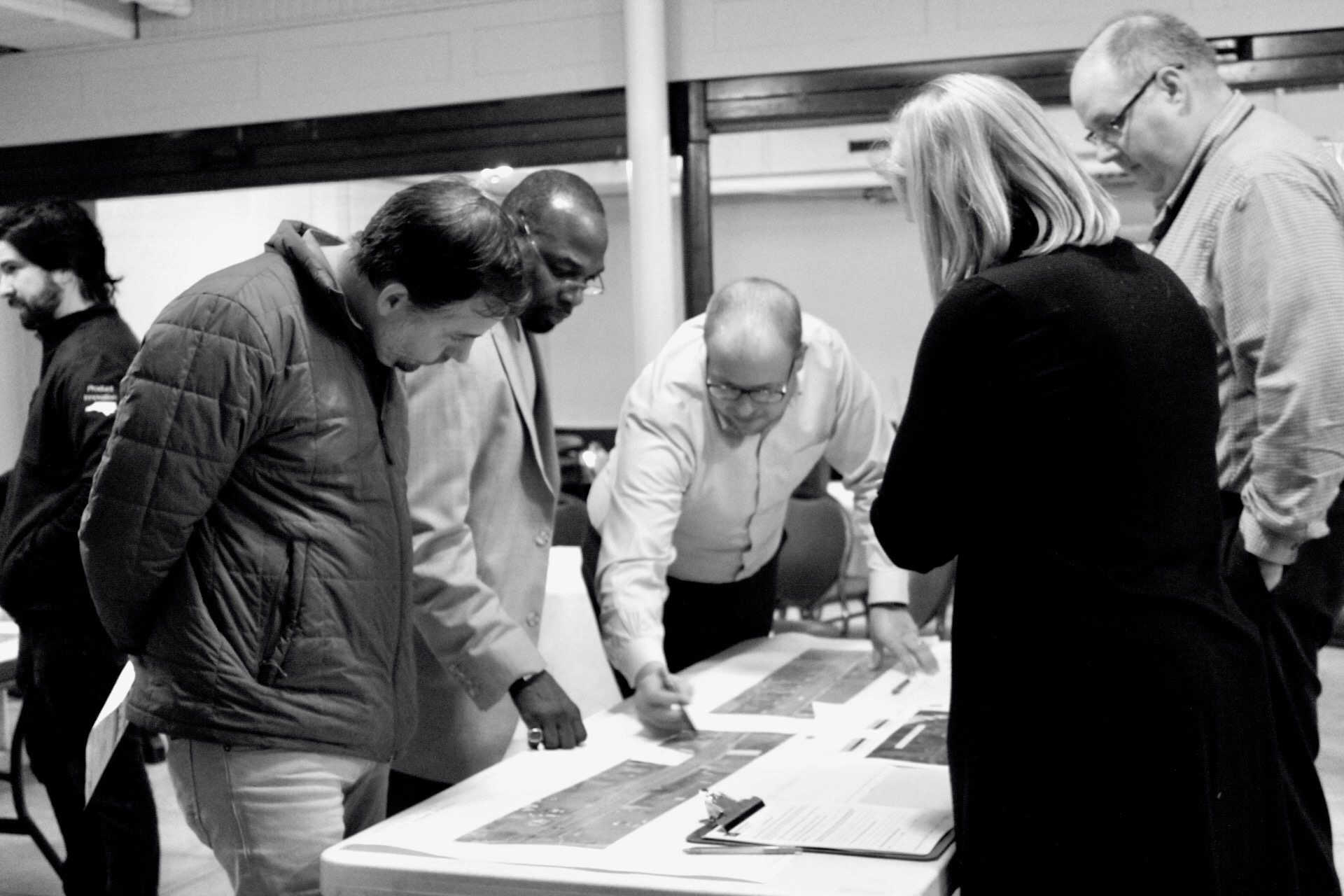 Durhamites in business casual stand around them, looking puzzled and clicking their city-issued pens contemplatively. At one table, a few landlords and developers from the area chat up transportation representative Ellen Beckmann about unmarked loading zones. At the other, cycling safety carries the conversation.